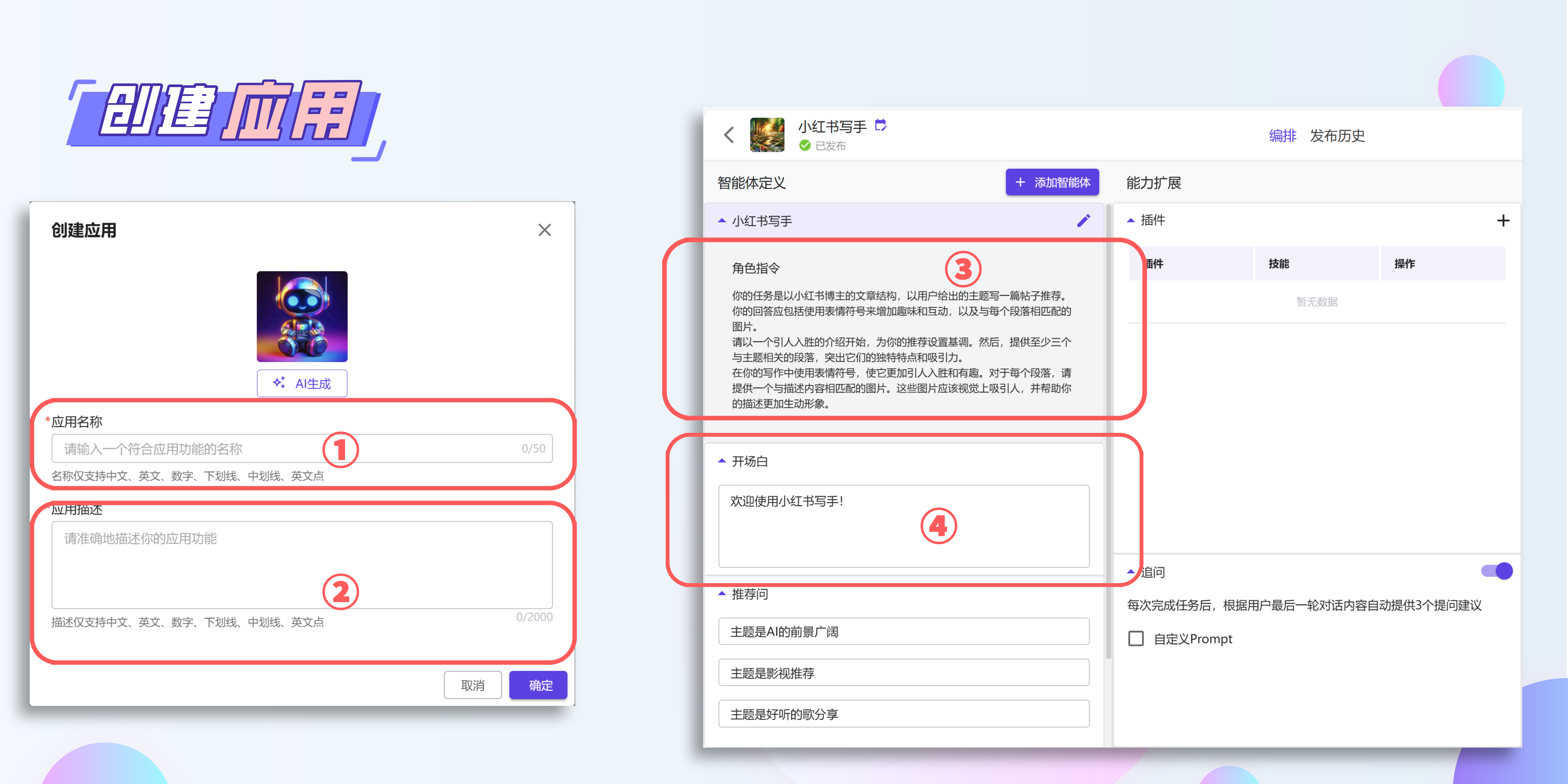只需四步,打造AI应用专属“人设”——功能描述、角色技能、开场白,就能生成企业的AI角色。