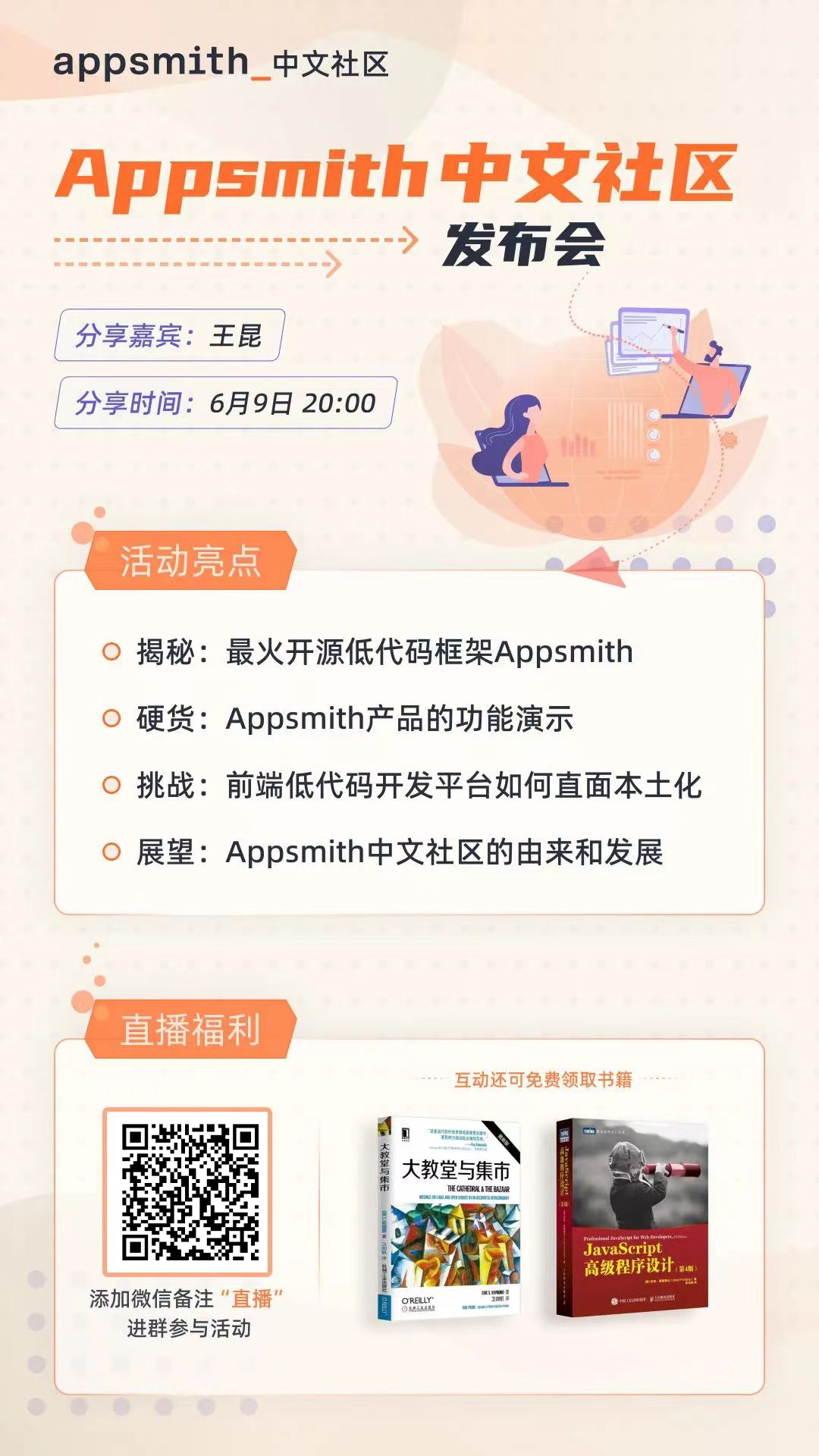 想了解这款Github上最火的低代码平台?6月9日20:00,Appsmith 中文社区将举行线上发布会!活动将进一步讲解Appsmith的功能特色,分享前端低代码平台如何直面本土化发展,并重磅介绍Appsmith中文社区的由来和发展!