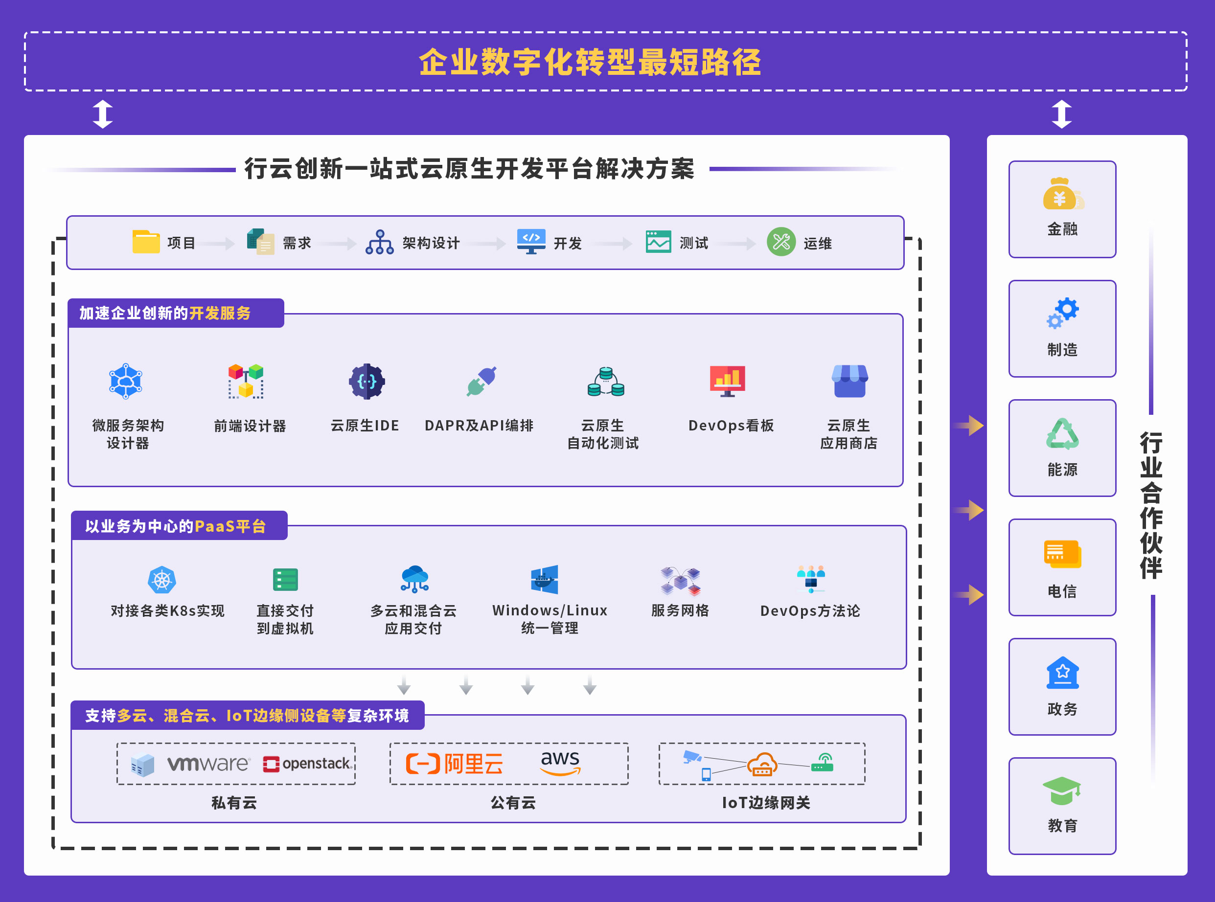 以国内领先的一站式云原生开发平台行云创新为例,其产品 CloudOS 底层采有容器和K8S技术,上层通过易用性的设计,让用户无需了解容器或是K8S的技术概念和使用知识也可以轻松使用本产品实现应用的快速开发和快速上线。通过“系统架构模板”定义企业的开发标准、架构标准,开发人员更轻松地编写符合企业技术标准的程序。
